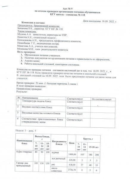 16 қыркүйек 2022 0 1 2 3 4 5 Акт №9 по итогам проверки организации питания обучающихся КГУ "Школа-гимназия №118" УО города Алматы Осы беттің QR-коды:QR-код этой страницы: